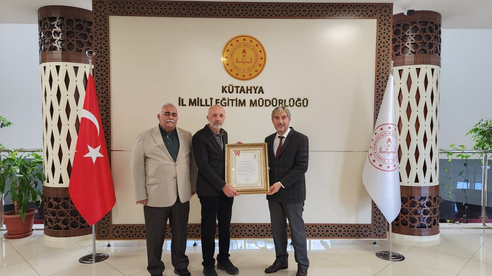 Türk Kızılay Batı Anadolu Bölge Kan Merkezi Müdürü Dr. Ali MUMCU, Kütahya Kızılay Kan Merkezi Müdürü Dr. Mahmut ULUSOY, Kan Bağışçısı Kazanım Uzmanları Dilay TUZCU ve Uğur SERÇEBAY, İl Millî Eğitim Müdürlüğümüzü ziyaret ederek okul ve kurumlarımızda yürütülen kan bağışı faaliyetlerine verilen destek dolayısıyla "Altın Kurumsal Kan Bağışçısı Belgesi" ve plaketini takdim ettiler.